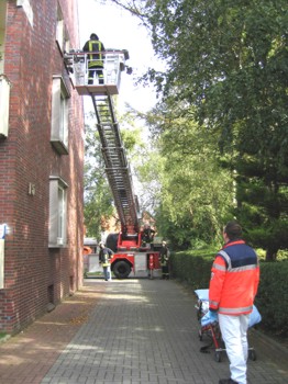 Am 01.10.2009 gegen 12.15 Uhr gab es einen Einsatz für die Drehleiter der Freiwilligen Feuerwehr Norden. Auf Anforderung des Rettungsdienstes musste in der Koppelstrasse aus dem zweiten Obergeschoss eines Wohngebäudes eine bettlägerige Patientin in den bereitstehenden Rettungswagen befördert werden. Mit Hilfe einer Spezialtrage auf dem Korb der Drehleiter konnte die Patientin sicher dem Rettungsdienst übergeben werden. Nach ca. einer Stunde war der Einsatz für die Feuerwehr, die mit sechs Einsatzkräften vor Ort war, beendet.