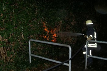 Nachdem die Freiwillige Feuerwehr Norden bereits am Freitagabend einen Heckenbrand in der Eichenstraße löschen musste, wurde sie am Sonntag gegen 23.35 Uhr erneut zu einer brennenden Hecke gerufen. Diesmal brannte eine Totholzhecke in der Schulstraße in der Nähe des Kindergartens. Auf einer Länge von über zehn Metern brannte das Gestrüpp. Da die Hecke einen erheblichen Umfang besaß und das Feuer sich schon tief hineingefressen hatte, brauchten die neun angerückten Feuerwehrmänner fast zwei Stunden bis sie das Feuer gelöscht hatten. Hierzu war es notwendig den betroffenen Bereich vollständig von Hand abzutragen.