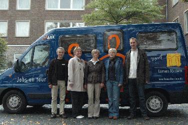 „Jobs on tour“ soll eine Lücke im Kreis Steinfurt füllen. Obwohl in allen größeren Kommunen Bewerberzentren für die Empfänger von Arbeitslosengeld II eingerichtet wurden, werden nicht alle Menschen erreicht. Manche sind weniger mobil und beispielsweise aus Metelen ist das nächste Bewerberzentrum in Steinfurt nur umständlich ohne Auto zu erreichen. Zudem sollen die schon bestehenden Anlaufpunkte entlastet werden. Deshalb haben der Lernen fördern e.V. und der Kreis Steinfurt „Jobs on tour“ entwickelt. Seit August macht dieses mobile Bewerberzentrum an 16 unterschiedlichen Standorten im Kreis Steinfurt halt. In den blauen Bulli passt alles, was Sabine Deiters und ihre Kollegen für ihre Arbeit brauchen: Sitzgelegenheiten, Computer mit Internetzugang, Platz zum Schreiben.