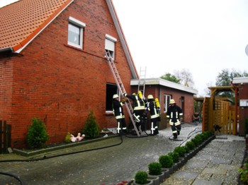 Am Montag gegen 13.45 Uhr wurde die Freiwillige Feuerwehr der Stadt Norden zu einem Gebäudebrand in die Manningastraße gerufen. Zu diesem Zeitpunkt befanden sich noch Menschen im Gebäude und die Leitstelle Aurich löste daraufhin Vollalarm aus. Über eine vorgefundene Aluleiter versuchten Polizeibeamte, die kurz vor der Feuerwehr an der Einsatzstelle eintrafen, sich Zugang in das Obergeschoss zu verschaffen. Stadtbrandmeister Kettler indes konnte durch den Hauseingang über das Treppenhaus noch im letzten Moment zum Kinderzimmer vordringen. Hier fand er dann auf Anhieb das Kind (etwa ein Jahr) in seinem Bett.