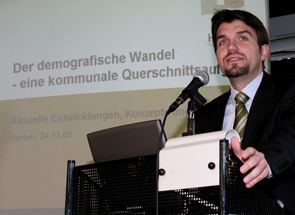 Die Eingangsreferate hielten Stadtbaurat Volker Lindner und Ralf Zimmer-Hegmann vom Institut für Landes- und Stadtentwicklung (ILS) zu dem Thema „Stadtentwicklung im demografischen Wandel“. Laut einer Studie des ILS erhoffen sich die meisten Städte von der Ausweisung neuer Wohngebiete einen Stopp des Bevölkerungsrückgangs. Volker Lindner stellte am Beispiel Hertens dar, dass die Stadt durch gezielte Wirtschaftsentwicklung und Wohnbaupolitik ebenfalls neue Einwohner gewinnen will, sich mit ihren Konzepten zum Stadtumbau aber auch auf die Schrumpfung einstellt und diese als Chance begreift: „Kleiner zu werden ist nicht dramatisch, wenn die passenden Strukturen geschaffen werden“, ist Volker Lindner überzeugt.