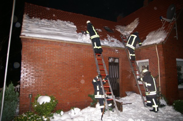 Am ersten Weihnachtsfeiertag wurde die Freiwillige Feuerwehr Norden um 5.12 Uhr erneut zu einer Schneebeseitigung gerufen. Auf dem Dach eines Hauses an der Ostermarscher Straße hatte sich Eis in der Regenrinne gebildet und tauenden Schnee daran behindert abzufließen. Das Wasser suchte sich seinen Weg anderweitig und floss durch das Dach ins Hausinnere. Dies allein ist nicht zwangsläufig ein Grund für den Einsatz der Feuerwehr, da das Wasser aber in nicht unerheblichen Mengen in den Sicherungskasten des Hauses lief, war ein der Einsatz doch gerechtfertigt. Die zehn angerückten Feuerwehrmänner brachten zwei Leitern in Stellung und schaufelten das Schnee vom Dach und schafften eine Abflussmöglichkeit für das Tauwasser. Nach etwa einer Stunde war der Einsatz beendet. Der Notdienst der Norder Stadtwerke war ebenfalls vor Ort und hatte die Hauptsicherungen entfernt.