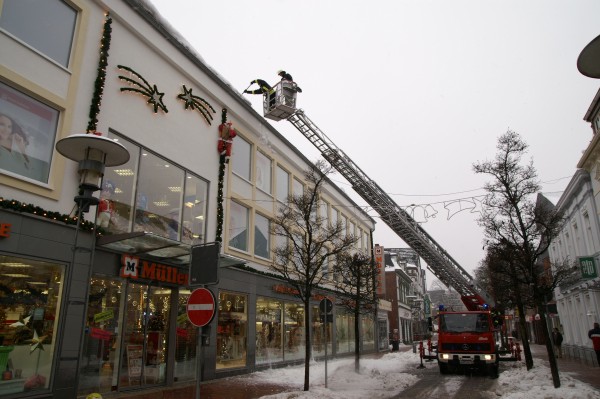 Die Sache mit der weißen Weihnacht haben sich die Mitglieder der Freiwilligen Feuerwehr Norden irgendwie anders vorgestellt. Am Mittag des ersten Weihnachtsfeiertages mussten sie erneut ausrücken um Schnee und Eis von einem Dach zu entfernen. Diesmal ging es zur Drogerie Müller in der Osterstraße. Dort hatten sich oberhalb der Schaufensterfront Schnee- und Eismassen gelöst und drohten vom Dach auf den Gehweg zu stürzen. Desweiteren drohte die gläserne Überdachung des Haupteinganges beschädigt zu werden. Mit Hilfe der Drehleiter konnten zwei Feuerwehrmänner das Dach freischaufeln. Die Polizei sperrte anschließend den Gehweg vor dem Geschäft ab, da im wieder Schnee nachrutschte. Die Osterstraße musste für die Dauer des Einsatzes etwa eine Stunde für den Verkehr gesperrt werden. Dies war bereits der vierte Einsatz dieser Art innerhalb weniger Tage.