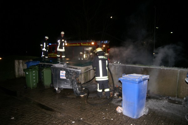 In der Nacht zu Montag wurden der Freiwilligen Feuerwehr Norden mehrere brennende Müllcontainer vor dem Alten Zollhaus in der Straße Am Norder Tief gemeldet. Auf dem Parkplatz des als Wohn- und Geschäftshaus genutzen Gebäudes brannten gegen 3.10 Uhr mehrere Mülltonnen und -container. Die zuerst eingetroffene Polizei hatte den Brand bereits mit einem Feuerlöscher eingedämmt. Die mit einem Fahrzeug ausgerückten Feuerwehrleute löschten die verschmolzenen Reste endgültig ab.
