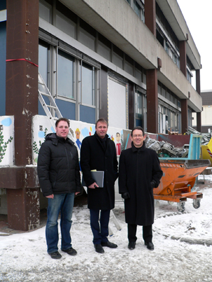 Baustart an der Grundschule Simmershausen Fuldatal. Nachdem in den Winterferien das „Pavillon-Dorf“ direkt neben dem Schulhof der Grundschule Simmershausen aufgestellt wurde, starten jetzt die Modernisierungsarbeiten im leergeräumten Schulgebäude. „Die Entkernungsarbeiten sind bereits in vollem Gang“, informiert Uwe Schenk, Abteilungsleiter Bauen des Fachbereichs Schulen und Bauwesen des Landkreises Kassel. Im Zuge der Abrissarbeiten erfolgt auch eine Schadstoffsanierung des Gebäudes. „In den 70er Jahren wurden viele Baustoffe verwendet, die heute als Schadstoffen betrachtet werden – während des Schulbetriebs bestand allerdings keine Gesundheitsgefährdung, da die problematischen Stoffe in Decken- und Wandverkleidungen enthalten sind und nicht zugänglich waren“, erläutert Schenk weiter. 2,5 Millionen Euro aus dem Sonderinvestitionsprogramm des Landes Hessen fließen in die grundlegende Modernisierung des im Jahr 1973 errichteten Schulgebäudes. Die Schule Simmershausen ist wie viele andere Schulen aus den 70er Jahren im Landkreis Kassel als „Beton-Rasterbau“ erstellt worden, so Schenk. Bei der Modernisierung der Schule könne jetzt so gebaut werden, dass die aktuellen grundschulpädagogischen Anforderungen sowie die Vorgaben für eine moderne Energienutzung beispielhaft berücksichtigt werden können. Im Bereich Energie werde die vorhandene ungedämmte Alu-Glas-Betonfassade komplett durch Mauerwerk mit Fenstern ersetzt. „Zusammen mit der umfassenden Wärmedämmung und der Erneuerung des Flachdaches erfüllen wir dann die neuesten Vorschriften der Energie-Einsparverordnung“, berichtet Schenk. Auch in der Aufteilung des Schulgebäudes sei von den beauftragten Architekten des Kasseler Büros RSE zusammen mit Schulleiter Achim Kessemeier ein Konzept gefunden worden, dass neben modernen Klassenräumen auch Lernlandschaften ermögliche, in denen die Kinder selbständig Inhalte erarbeiten können. Durch eine Neuaufteilung der Haustechnik sowie der Funktionsräume werde die Schule für Schüler und Lehrer auch im Inneren „ein neues Gesicht“ erhalten. Nach dem Umbau stehen acht Klassen, ein EDV-Raum, eine Schülerbibliothek, ein Betreuungs- und ein Projektraum, sowie ein Multifunktionsraum zur Verfügung. Auf jedem Geschoss sind Lernlandschaften eingeplant. Schenk: „Während der rund einjährigen Bauzeit müssen Schüler und Lehrer leider in ein Pavillon-Dorf umziehen – allerdings zeigen die ersten Erfahrungen, dass die Schulgemeinde gut mit den immer mit einer Baustelle verbundenen Einschränkungen umgehen kann“. Lehrerzimmer, Verwaltung und Betreuung sind während der Bauarbeiten in der „Alten Schule“ untergebracht. Die Modernisierung der Simmershäuser Grundschule soll Ende des Jahres 2010 abgeschlossen sein. Hintergrund: Das Gebäude der Grundschule Simmershausen stammt aus dem Jahr 1973 und entspricht sowohl von den Brandschutzvorgaben wie auch von den energetischen Voraussetzungen nicht den heutigen Anforderungen an eine Grundschule. Die Grundschule Simmershausen ist mit aktuell 156 Schülern und 8 Klassen die zweitgrößte Grundschule in Fuldatal. Seit dem Schuljahr 1993/94 ist an der Schule ein Betreuungsangebot eingerichtet. Seit zwei Jahren wird an der Grundschule der flexible Schulanfang praktiziert. Im letzten Jahr erhielt die Schule die Anerkennung als Referenzschule für die vorbildliche Beteiligung von Schülern und Eltern am Unterricht und schulischen Leben vom Staatlichen Schulamt für die Stadt und den Landkreis Kassel. Der Einzugsbereich der Grundschule umfasst die Fuldataler Ortsteile Simmershausen, Knickhagen, Wahnhausen und Wilhelmshausen. In den nächsten sechs Jahren wird die Schülerzahl der Schule schrittweise auf 85 Schüler sinken. Schulleiter ist Achim Kessemeier. Pressekontakt: Pressestelle LANDKREIS KASSEL, Harald Kühlborn Zu dieser Meldung können wir Ihnen folgendes Medium anbieten: Simmershausen Baustart Auf dem Foto sieht man von links nach rechts vor dem zum Teil entkernten Schulgebäude frierend Bastian Fleck (Grundschule Simmershausen), Architekt Stefan Stiegel und Uwe Schenk (Landkreis Kassel).