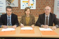 Gisela Werner, Leiterin des Berufskollegs Viersen, Ingo Schabrich, Dezernent für Jugend und Bildung, Gesundheit und Soziales (rechts), und Dr. Peter Runia, Dozent für Marketing und Beauftragter der Fontys Venlo für Kooperation, unterzeichneten im Berufskolleg einen Kooperationsvertrag.