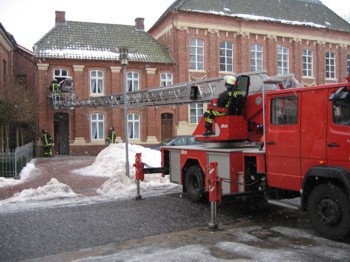 Am 9. Februar um 15.36 Uhr wurde die Drehleiter der Feuerwehr Norden vom Rettungsdienst angefordert. Eine Frau konnte von der Besatzung eines Rettungswagens nicht über eine steile Treppe in ihre Wohnung am Markt gebracht werden. Bedingt durch Schneeberge am Straßenrand musste die Leiter in einiger Entfernung vom Gebäude in Stellung gebracht werden.