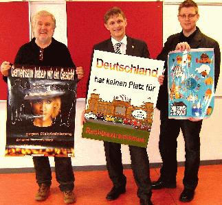 Wolfgang Busch mit dem Plakat des Hansa Berufskollegs Unna, Landrat Michael Makiolla mit dem Beitrag der Willy-Brandt-Gesamtschule Bergkamen und Carsten Winkel zeigt das Plakat der Harkortschule Unna (v. l.). Foto: Kreis Unna.