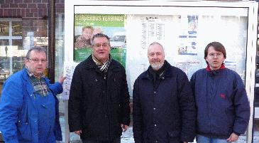 Gaben jetzt den Startschuss für die Instandsetzungsaktionen (v.l.): Wolfgang Knipschild, BRS-Haltestellen- und Streckenkontrolleur, Paul-Gerhard Kollhorst, Fachbereichsleiter bei der Stadt Fröndenberg, Klaus-Peter Dürholt, ÖPNV-Planer beim Kreis Unna und Stephan Matthies, Angebotsplaner bei Busverkehr Ruhr-Sieg vor der neuen Info-Vitrine in Fröndenberg-Mitte.