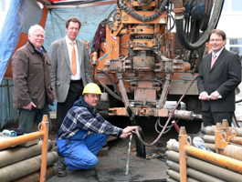Statt Öl Wärme - Geothermie-Test für die IGS Kaufungen Kaufungen. „Wird den hier nach Öl gebohrt?“, fragten sich Anwohner der integrierten Gesamtschule Kaufungen in den letzten Tagen. Neben dem entstehenden Rohbau für die neuen Gebäude der Schule stand allerdings nicht Öl im Mittelpunkt des Interesses, sondern ein sogenannter „Response Test“, mit dem die Voraussetzungen für den Einsatz von Geothermie geprüft wurden. „Wir wollen für den Neubau der integrierten Gesamtschule Kaufungen eine „Green-Building“-Zertifizierung erreichen – deshalb haben wir uns dafür entschieden, die neuen Gebäude als Niedrigenergiegebäude zu konzipieren und mit Geothermie zu beheizen“, informiert Jörg Schaal, Niederlassungsleiter der OFB Projektentwicklungs GmbH Kassel. Die neue IGS Kaufungen wäre dann die erste Schule in Europa, die diesen hohen Umweltstandard erreichen würde. Berechnungen der Ingenieurgesellschaft enco aus Kassel hatten ergeben, dass eine Energieversorgung mit Geothermiebohrungen und einer angekoppelten Wärmepumpe den wirtschaftlichsten Betrieb der Heizenergieversorgung der IGS Kaufungen darstellt. Schaal: „Mit dieser Lösung sparen fast die Hälfte des bisherigen Primärenergieverbrauchs ein und reduzieren die CO²-Emission um fast 60 Prozent“. Jürgen Winter, Geschäftsführer der TERRA THERM Erdwärme GmbH aus Fulda, erläutert: „Mit der jetzt durchgeführten 100 Meter tiefen Probebohrung haben für jeden Meter Proben entnommen, um so die thermischen Eigenschaften des Untergrunds zu ermitteln“. Nach Auswertung der Proben könne die endgültige Zahl der notwendigen Sonden zur Gewinnung von Erdwärme festgelegt werden. „Wir gehen von 13 bis 17 Bohrungen aus“, berichtet Winter. Die Bohrungen selbst sollen dann in den Sommerferien durchgeführt werden. Hintergrund: Anlass für den Ersatzneubau der IGS Kaufungen war eine im Jahr 2007 festgestellte PCB-Belastung des Allgemeinen Unterrichtsgebäudes der Schule. Für den Neubau investiert der Landkreis Kassel 13,5 Millionen Euro aus dem Landesprogramm „Schul- und Hochschulbau“ - die Restsumme für den rund 21 Millionen teuren Neubau wird über ein Schulbauinvestitionsprogramm im Rahmen einer Öffentlich-Privaten-Partnerschaft (ÖPP) abgewickelt. Auf dem Schulgelände entstehen in einem ersten Schritt 36 neue Klassenräume, die in zweigeschossiger Bauweise realisiert werden. Der Neubau der Klassenhäuser soll spätestens zum 1.2. 2011 abgeschlossen sein – eine achtwöchige Bauverzögerung durch den langen Winter wird durch den großen Einsatz der beteiligten Firmen weitgehend wieder eingeholt werden können. Danach wird das nicht mehr benötigte Allgemeine Unterrichtsgebäude abgebrochen und im Anschluss das Zentralgebäude neu gebaut. Einschließlich der Sanierung des Technischen Gebäudes sollen alle Bauarbeiten im Herbst 2013 beendet sein. Pressekontakt: Pressestelle LANDKREIS KASSEL, Harald Kühlborn Zu dieser Meldung können wir Ihnen folgendes Medium anbieten: Geothermie Kaufungen Auf dem Foto sieht man von links nach rechts Architekt Joachim Döring, TERRA THERM Geschäftsführer Jürgen Winter, Bohrmeister Wilhelm Fenske und OFB-Niederlassungsleiter Jörg Schaal.