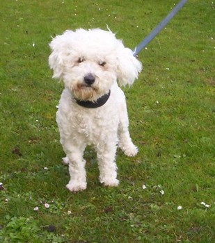 Lucky wurde von seinen Besitzern bei uns abgegeben, sie hatten aus beruflichen Gründen nicht mehr genügend Zeit für den Rüden. Lucky hat schneeweißes, gelocktes Fell.