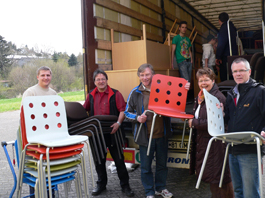 Rumänienhilfe Auf dem Foto sieht man von links nach rechts Juri Jurimaa (Hausmeister der Elisabeth-Selbert-Schule Zierenberg), Michael Groth (Hausmeister Elisabeth-Selbert-Schule), Prof. Heinrich Schnatmann, Schulleiterin Ute Walter und Michael Hümer (Landkreis Kassel) beim Verladen von Schulmöbeln.