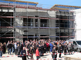 Richtfest für Neubau der IGS Kaufungen Kaufungen. „Bei allen Schulbaumaßnahmen im Landkreis Kassel hatten wir mit dem langen Winter zu kämpfen – trotz des Zeitverlustes von mehr als acht Wochen konnte der geplante Richtfesttermin eingehalten werden“, freut Landrat Uwe Schmidt beim Richtfest für den Neubau der Integrierten Gesamtschule Kaufungen. Schmidt bedankt sich bei den am Bau beteiligten Unternehmen, dem Architekten Joachim Döring aus Kaufungen und den Mitarbeitern der GHT-Gesellschaft für Projektmanagement in Kassel dafür, dass es trotz der frostbedingten Verzögerungen gelungen ist, im April Richtfest zu feiern. Besonders positiv sei, dass auch der Kostenrahmen für den Neubau bisher eingehalten worden ist. Schmidt: „Dies zeigt, dass der Architekt und wir gut vorgearbeitet haben und die fast ausschließlich aus der Region stammenden Firmen gute Angebote abgegeben haben“. Bisher konnten für das neue Gebäude der IGS Kaufungen Aufträge im Wert von rund 850.000 Euro abgerechnet werden. Der Kreis rechnet mit einem Gesamtkostenvolumen von rund 9 Millionen Euro, die aus dem Sonderinvestitionsprogramm des Landes Hessen finanziert werden. Landrat Schmidt erinnert daran, dass der Anlass für den Ersatzneubau die PCB-Belastung des Allgemeinen Unterrichtsgebäudes der IGS Kaufungen ist. Ursprünglich hatte der Kreis geplant, diese Investition in dem für den Landkreis mittlerweile „gewohnten und bewährten“ Modells einer Öffentlich-Privaten-Partnerschaft (ÖPP) durchzuführen. Nicht zuletzt auf Drängen des Regierungspräsidiums Kassel, das einer Aufstockung der ÖPP-Investitionspakete ablehnend gegenüberstand, habe man entschieden, 13,5 Millionen Euro aus dem Landesprogramm „Schul- und Hochschulbau“ für die IGS Kaufungen zu nutzen. Die Restsumme für die auf rund 21 Millionen Euro veranschlagte teuren Baumaßnahme werde über ÖPP abgewickelt, teilt der Landrat mit. Im Rohbau gut erkennbar ist die Aufteilung der 36 neuen Klassenräume, die in zweigeschossiger Bauweise realisiert werden. Schmidt: „Bereits jetzt wird deutlich, dass das beabsichtigte kleine Dorf das Schulleben der IGS Kaufungen total verändern wird“. Die Weitläufigkeit des „kleinen Schuldorfes“ werde „ganz sicher“ auch ein pädagogischer Gewinn für Lehrer und Schüler sein. „Wir wollen eben nicht nur in Energieeffizienz und Brandschutz investieren, sondern auch in eine Bildungsatmosphäre an unseren Schulen, die Voraussetzung dafür ist, dass Lernen und Lehren wieder mehr Spaß macht“, macht der Landrat die Ziele des Landkreises deutlich. Der Neubau der Klassenhäuser soll Ende 2010 abgeschlossen sein „und wir sind guter Dinge, dass das auch klappt“ kündigt Schmidt an, so dass die Schüler nach den Winterferien 2011 in die neuen Schulgebäude umziehen können. Danach wird das nicht mehr benötigte Allgemeine Unterrichtsgebäude abgebrochen und im Anschluss das Zentralgebäude neu gebaut. „Einschließlich der Sanierung des Technischen Gebäudes werden wir im Herbst 2013 alle Bauarbeiten beenden können“, so der Landrat weiter. Dann hoffe er – und sicherlich auch die gesamte Schulgemeinde – dass die nächsten dreißig Jahre „erst mal keine größeren Bauarbeiten an der IGS Kaufungen nötig sind“, so Schmidt abschließend. Hintergrund: Die IGS Kaufungen wurde von 1989 bis 1995 Asbest- und PCB saniert. In den folgenden Jahren haben an der Schule umfangreiche Sanierungs- und Modernisierungsmaßnahmen stattgefunden. Dazu gehörten die Vollendung der multifunktional nutzbaren Pausenhalle und Baumaßnahmen in Verbindung mit dem ausgebauten Ganztagsangebot der Schule. 2007 schloss sich eine ÖPP-Grundsanierung an. Im Zuge dieser Arbeiten wurden an der Fassade des Allgemeinen Unterrichtsgebäude im Bereich der Fugen zwischen den Betonteilen unregelmäßige Füllungen festgestellt. Messungen in den Klassenräumen ergaben erhöhte PCB-Werte, die letztlich zur Entscheidung führten, das betroffene Gebäude abzubrechen und die benötigten Klassenräume an anderer Stelle des Schulgeländes neu zu errichten. Pressekontakt: Pressestelle LANDKREIS KASSEL, Harald Kühlborn Zu dieser Meldung können wir Ihnen folgende Medien anbieten: IGS Kaufungen 002 Auf den Fotos sieht man die Ausführung des Richtspruchs, die dem Richtspruch lauschenden zahlreichen Besucher und GHT-Niederlassungsleiter Jörg Schaal, Architekt Joachim Döring und Landrat Uwe Schmidt vor dem Schulneubau.