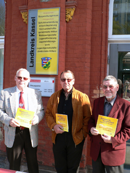Neuer Wegweiser für Senioren liegt vor Kreis Kassel. Der neue Seniorenwegweiser für den Landkreis Kassel ist erschienen und ab sofort kostenlos bei der Kreisverwaltung und den Gemeinden und Städten im Kreis erhältlich. „Auf 46 Seiten wird ein umfassendes Informationsangebot für ältere Menschen und ihre Angehörigen geboten“, stellt Vizelandrätin Susanne Selbert die Nützlichkeit des zum sechsten Mal herausgegebenen Seniorenwegweisers heraus. Er sei damit eine wertvolle Orientierungshilfe und erleichtere die Suche nach Informationen. Selbert: “Der Wegweiser leistet so seinen Anteil daran, dass man auch im Alter ein selbständiges Leben mit einer hohen Lebensqualität führen kann“. Das Informationsangebot des Seniorenwegweisers reicht von „Auskunft und Beratung“ über „Wohnen im Alter“ und „Hilfe und Pflege zu Hause“ bis hin zu „Finanzierungsfragen“ und „Vorsorgemöglichkeiten“. Er enthält zudem eine Übersicht über Ansprechpartner und Adressen der Angebote im ambulanten, teilstationären und stationären Bereich der Altenpflege. Die kostenlose Broschüre, die in Kooperation mit dem VKW-Verlag erarbeitet wurde, liegt in einer Auflage von 8.500 Exemplaren vor. „Diese hohe Auflage zeigt, dass die Nachfrage und das Informationsbedürfnis enorm groß ist,“ betont Selbert. Der Wegweiser kann in den Rathäusern der kreisangehörigen Kommunen und den Dienststellen der Kreisverwaltung persönlich abgeholt oder telefonisch über die Altenhilfeplanungsstelle des Landkreises unter der Telefonnummer 0561/1003-1363 (Karin Tietz) angefordert werden. Pressekontakt: Pressestelle LANDKREIS KASSEL, Harald Kühlborn Zu dieser Meldung können wir Ihnen folgende Medien anbieten: Seniorenwegweiser 002 Auf den beiden Fotos sieht man wahlweise drei Senioren (von links nach rechts: Friedhelm Hildebrandt, Jürgen Brandstetter und Ulrich Eckel/alle Fuldatal), die sich den neuen Wegweiser im Büro der Altenhilfeplanung des Landkreises im KulturBahnhof Kassel abgeholt haben oder die drei Herren mit (von links nach rechts: Doris Brandstetter-Weddig und Karin Tietz von der Altenhilfeplanung des Landkreises).