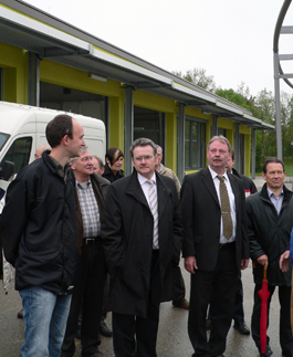 Besuch aus dem Ilm-Kreis – 20 Jahre Kreispartnerschaft Landkreis Kassel/Ilmkreis. Am 6. und 7. Mai besuchte eine Delegation des thüringischen Ilm-Kreises den Landkreis Kassel. „Der Jubiläumsbesuch im 20. Jahr unserer Kreispartnerschaft führte unsere thüringischen Freunde ins Wolfhager Land“, berichtet Landrat Uwe Schmidt. Nach einem gemeinsamen Abendessen im Hotel Emstaler Höhe in Bad Emstal stand am 7. Mai ein Besuch des Konversionsprojektes ehemalige Pommernkaserne in Wolfhagen auf dem Programm. Schmidt: „Wir haben Landrat Dr. Benno Kaufhold, dem Beigeordneten Rainer Zobel, der Kreistagsvorsitzenden Beate Misch sowie den fünf weiteren Mitgliedern des Kreistages die neue Herwig-Blankertz-Schule und das Unternehmen Energy-Glass gezeigt“. Die Berufsschullandschaft in den beiden Kreisen stellt sich sehr unterschiedlich dar, so der Landrat weiter. Während sich im Ilm-Kreis aktuell die Zahl der Berufsschüler durch den starken Geburtenrückgang nach der Wende 1990 fast halbiert hat, seien im Landkreis Kassel in den nächsten Jahren die Schülerzahlen an den Berufsschulen „relativ stabil“. Weitere Themen der kommunalpolitischen Gespräche der Vertreter der beiden Gebietskörperschaften waren die Zukunft der Aufgabenwahrnehmung für die Bezieher von Leistungen nach dem Sozialgesetzbuch II und die finanzielle Lage der Kommunen und Kreise. Zukünftig soll auch der kulturelle Austausch zwischen den beiden Landkreisen vertieft werden. Nach einem abschließenden Mittagessen in Wolfhagen traten die Gäste aus dem Ilm-Kreis wieder ihre Heimreise an. Pressekontakt: Pressestelle LANDKREIS KASSEL, Harald Kühlborn Zu dieser Meldung können wir Ihnen folgendes Medium anbieten: Ilmkreis Auf dem Foto sieht man von links nach rechts Karsten Schmacke (Kreisbeigeordneter Kassel), Landrat Uwe Schmidt, Landrat Dr. Benno Kaufhold und Uwe Schenk (Kreisverwaltung Kassel) beim Besuch der Herwig-Blankertz-Schule in Wolfhagen.