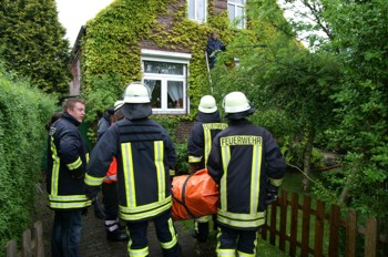 Eine geistige verwirrte Frau hatte es sich am Sonntagnachmittag auf einer Leiter in einem Vorgarten an der Norddeicher Straße bequem gemacht. Die Bewohner des Hauses bemerkten die fremde Frau sitzend auf der Leiter, welche sie selber an den Giebel des Hauses angestellt hatte. Polizeibeamte und Mitarbeiter des Rettungsdienstes wollten die Frau dazu bewegen, die Leiter wieder hinabzusteigen. Die Aufforderungen wurden aber mit Schweigen und Fußtritten quittiert. Auch der anhaltende Dauerregen konnte ihre Entscheidung nicht beeinflussen. Die ebenfalls angerückte Freiwillige Feierwehr Norden baute vorsichtshalber ein aufblasbares Sprungkissen, einen Sprungretter, auf. Dieser imposante Auflauf von Helfern und Gerätschaft stimmte die Frau dann letztlich doch um und sie kletterte die Leiter alleine wieder runter. Sie bat noch um ein Foto für die BILD-Zeitung um dann von der Polizei in den Rettungswagen geleitet zu werden. Vorher die Frau stammte und was ihre Beweggründe waren, war zunächst unklar. Suizidale Absichten äußerte sie nicht.