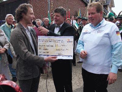 Besondere Geburtstagsgeschenke brachte Lorenz Dik von der Euregio mit. Für die Ausrichtung des Festes überreichte er Fördermittelbescheide in Höhe von insgesamt 5.950 Euro an den Bürgerschützenverein und das Grenzland-Tambourkorps Anholt sowie Horeca Nederland.
