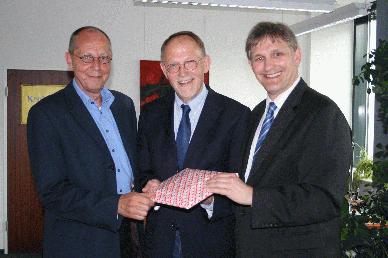 Bildzeile: Überreichten Schulamtsdirektor Hermann Diekneite zum Abschied ein kleines Präsent: Landrat Michael Makiolla (r.) und Kreis-Schuldezernent Dr. Detlef Timpe (l.). Foto: Kreis Unna