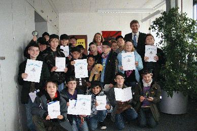 Am Ende der Tour durfte auch ein Besuch beim Behördenchef nicht fehlen: Landrat Michael Makiolla stand den Jungdetektiven Rede und Antwort und verriet ihnen schließlich auch das gesuchte Lösungswort. Das wiederum hatten die pfiffigen Spürnasen alle richtig ermittelt. Zur Belohnung durften sie eine Urkunde und ein Klassenfoto mit dem Landrat mit nach Hause nehmen.