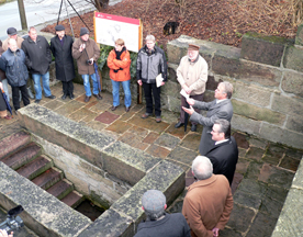 Eco Pfad Kulturgeschichte Wolfhagen eingeweiht Wolfhagen. „Die Eco Pfade im Landkreis Kassel sind ein Erfolgsmodell, das in der Region immer mehr an Bedeutung gewinnt“, stellt Landrat Uwe Schmidt bei der Eröffnung des Eco Pfades Kulturgeschichte in Wolfhagen fest. Der 18. Eco Pfad in der Region und der erste in Wolfhagen ermöglicht eine Zeitreise durch die Industrie- und Kulturgeschichte der ältesten Stadt im Landkreis Kassel. Schmidt: „Die Geschichte Wolfhagens hat soviel zu bieten, dass ich mir noch weitere Eco Pfade in Wolfhagen vorstellen kann“. Der Eco Pfad Kulturgeschichte Wolfhagen führt über rund 8 Kilometer vom Standort des ehemaligen rituellen Taufbad der jüdischen Gemeinde in der Schützeberger Straße über die Wüstung Langel und das Wasserschloss Elmarshausen zum Schützeberg mit seiner bedeutenden Kirchengeschichte. Weiter geht der Weg zur ehemaligen Papiermühle Schützeberger Hof, zu einer Infotafel über die Wolfhager Kolonien Philippinenthal, Philippinenburg und Philippinendorf an der Gedenkstätte des Bundes der Vertriebenen vorbei zurück zum Ausgangspunkt in der Nähe des Bahnhofs Wolfhagen. Landrat Schmidt dankt dem Heimat- und Geschichtsverein 1956 Wolfhagen und dem Hessisch-Waldeckischen Gebirgs- und Heimatverein für die Unterstützung bei der Ausarbeitung der Strecke, sowie Dr. Thilo Warnecke und Birgit Mietzner für die inhaltliche und grafische Gestaltung der Informationstafeln. Mit diesem breit gespannten Themenfeld passt der neue Eco Pfad in Wolfhagen „sehr gut in die Angebotspalette der Eco Pfade im Landkreis“, so der Landrat weiter. Schmidt: „Neben den archäologischen Eco Pfaden hat sich die Kulturgeschichte zu zweiten Säule der Eco Pfade entwickelt“. Wie die anderen Eco Pfade im Landkreis Kassel auch, will der Eco Pfad Kulturgeschichte Wolfhagen Lust auf die Beschäftigung mit lokaler und regionaler Geschichte wecken. „Anhand der Informationstafeln kann man auf eigene Faust eine Zeitreise zu Fuß unternehmen und dabei sicherlich Neues entdecken“, erläutert der Landrat das Motto der Eco Pfade. Die Texte erläutern den aktuellen Kenntnisstand über die jeweiligen historischen Stätten und das dazugehörige geschichtliche Umfeld. Die Länge der Strecke ist so ausgelegt, dass sie in einem nicht zu langen Spaziergang bewältigt werden können. Für den Eco Pfad benötigt man insgesamt etwas mehr als drei Stunden reine Gehzeit – man sollte sich aber ruhig mehr Zeit lassen, um die Zeitreise auch genießen zu können. Für die Gestaltung und Errichtung der Informationstafeln und der Wegweiser fallen für den neuen Eco Pfad Kosten in Höhe von rund 17.600 Euro an. Die Realisierung des Eco Pfades Kulturgeschichte Wolfhagen wurde vom Land Hessen und der Europäischen Union mit 8.700 Euro unterstützt – den Restbetrag übernimmt die Stadt Wolfhagen. Die Erfolgsgeschichte der kulturgeschichtlichen Wanderwege verdeutlicht die Vielzahl der noch geplanten Eco Pfade im Landkreis Kassel: weitere Eco Pfade sind in Grebenstein-Burguffeln, Habichtswald, Helsa-St. Ottilien, Hofgeismar, Hofgeismar-Hümme, Liebenau-Lamerden, Naumburg, Oberweser-Gieselwerder, Schauenburg, Wahlsburg und Zierenberg-Burghasungen geplant. „Die bisherigen Ecopfade in Bad Karlshafen, Baunatal, bei Calden, an der Diemel, am Dörnberg, von Knickhagen nach Wilhelmshausen, in Gottsbüren, in Grebenstein, Kaufungen und Lohfelden, bei Nieste, am Sensenstein und im Söhrewald werden gut angenommen“, informiert Schmidt. Auch im benachbarten Schwalm-Eder-Kreis hat die Idee Eco Pfade bereits gezündet. Hier besteht bereits ein archäologischer Eco Pfad rund um Altenburg und Falkenstein bei Niedenstein und für den Kirchberg bei Niedenstein ist ein weiterer Eco Pfad in Planung. Aktuelle Informationen über die Ecopfade im Landkreis Kassel gibt es auch im Internet. Unter www.eco-pfade.de sind sämtliche Faltblätter der Ecopfade im Kreis Kassel und die neuesten Entwicklungen zum Thema kulturgeschichtliche und archäologische Wanderstrecken zu finden. Außerdem liegen mittlerweile auch für drei Ecopfade Hörführungen vor. Schmidt: „Wir sind mit dem Dörnberg, Helmarshausen und Gottsbüren gestartet und werden als nächstes die Ecopfade Lohfelden, Nieste und Söhrewald und vielleicht auch Kaufungen vertonen“. Das Erstellen der Hörführungen, die entweder als MP3-Datei von der Internetseite herunter ladbar sind oder im Infozentrum des Naturparks Habichtswald auf dem Dörnberg und im Infozentrum Reinhardswald im Tierpark als CD für drei Euro zu erwerben sind, wird vom Land Hessen und der Sparkassenstiftung Kultur der Kasseler Sparkasse finanziell unterstützt. Pressekontakt: Pressestelle LANDKREIS KASSEL, Harald Kühlborn Zu dieser Meldung können wir Ihnen folgendes Medium anbieten: Eco Pfad Wolfhagen Auf dem Foto sieht man Bürgermeister Reinhard Schaake, Landrat Uwe Schmidt und die restliche Eröffnungsgemeinde an der ehemaligen Mikwe (rituelles jüdisches Taufbecken) in Wolfhagen.