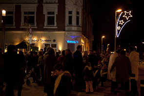 Vor dem Platz der Erlöserkirche standen die Zuschauer eng gedrängt, um ganz nah dabei zu sein: dann leuchteten die Sterne und Lichtbögen entlang der Straße auf. Von der weihnachtlichen Atmosphäre und diesem gemeinsamen Erlebnis waren die Besucher begeistert.