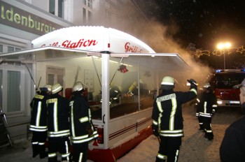 Aufmerksame Jugendliche haben am Donnerstagabend gegen 21.15 Uhr Rauch aus einem Imbisswagen in der Osterstraße steigen sehen und verständigten die Feuerwehr. Der Verkaufsanhänger ist dort vor einem Kreditinstitut anlässlich des Weihnachtsmarktes aufgestellt. Die Freiwillige Feuerwehr Norden rückte mit zwei Fahrzeugen und 18 Kräften an. Sie verschaffte sich Zugang ins Innere und stieß unterhalb eines Würstchengrills auf den Brandherd. Dort brannte der Holzkohlevorrat für den Grill. Vermutlich ist kurz vor Feierabend Glut aus dem Grill gerieselt und hat die Kohlen unbemerkt in Brand gesetzt. Das Feuer konnte schnell gelöscht werden. Die herbeigeeilte Eigentümerin des noch fast neuen Anhängers wollte den nur leicht beschädigten Verkaufswagen noch in der Nacht austauschen, um am nächsten Tag das Geschäft wieder zu eröffnen.