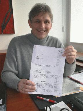 Bildzeile: Landrat Michael Makiolla mit dem wertvollen Bescheid. Foto: Kreis Unna