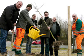 Bürgermeister Dr. Uli Paetzel brachte den ersten kleinen Apfelbaum direkt in die Erde: „Diesen Baum kaufe ich ganz privat, als Bürger der Stadt!“ Somit wird auch sein Name auf einer großen Tafel stehen, denn dort werden alle Baumbesitzer aufgeführt. „Vielleicht finden sich ja noch mehr Interessenten. Dann stocken wir die Anzahl vielleicht auf. Die ersten Anrufe habe ich schon bekommen“, hofft Egon Walberg, Koordinator für Sauberkeit und Stadtbildpflege. Bei ihm können sich kaufentschlossene Baumliebhaber melden.