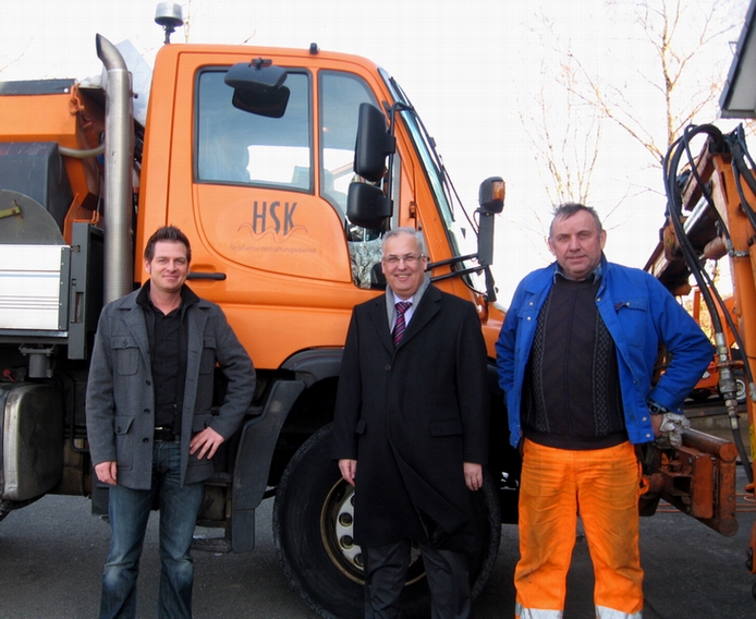 Landrat Dr. Karl Schneider (M.) ließ sich von David Witteler (l.) und Wolfgang Funke (r.) die Telematik-Technik der Winterdienstfahrzeuge erklären. / Foto: HSK