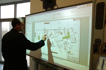 Das Besondere an diesem System ist, dass man das projektierte Bild mit speziellen Stiften an der Tafel bearbeiten und die Veränderungen abspeichern kann. So können Fahrzeuge, taktische Zeichen oder auch Einsatzabschnitte eingezeichnet und dokumentiert werden. Ein Einsatztagebuch läuft im Hintergrund und erfasst die Änderungen. Die Bedienung erfolgt ganz einfach per Fingerbewegung, direkt auf der Tafel, es funktioniert wie ein riesiger Touchscreen. Zum Einsatz kann dieses System bei Großschadenslagen kommen. "Die Technische Einsatzleitung wird bei komplexen Einsätzen ihre Stabsarbeit vom Hilfeleistungszentrum aus aufnehmen, dabei wird das SMARTBoard eine große Hilfe sein", so Stadtbrandmeister Karl Kettler bei der offiziellen Übergabe am Donnerstagnachmittag.