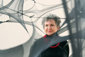 Die so entstandenen Werke erinnern an Reusen. „Der Phantasien sind jedoch keine Grenzen gesetzt“, betont die Künstlerin. „Die Netzstruktur und die persönliche Verortung darin“ sind ihre wiederkehrenden Themen. Darum spannen sich die zarten schwarzen Strümpfe quer durch den Raum. Mindestens 200 Stück hat sie für die Installation in Herten verarbeitet. „Strumpfhosen-Spenden, ob kaputt oder neuwertig, sind darum immer willkommen“, lacht die Künstlerin. In ihrer Sammlung finden sich echte Raritäten aus allen Jahrzehnten. Teilweise mit wilden Mustern oder zarten Stickereien. Über weiße Bildwände gespannt, wird ihre zarte Beschaffenheit erst wirklich deutlich.