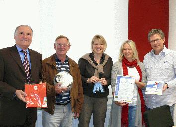 Die Sozialkampagne des DFB "Kinderträume 2011" wurde von den Spielern der deutschen Nationalmannschaft unter dem Dach des Deutschen Fußballbundes anlässlich der Frauen-WM 2011 in Deutschland ins Leben gerufen. Sie unterstützt gemeinnützige, lokale Projekte, die sich für das Wohl von Kindern und Jugendlichen einsetzen. Die Stadt Iserlohn hat sich mit ihrem Projekt "Ferien vor der Haustür" um eine Förderung beworben. Das vom Kinder- und Jugendbüro initiierte und gemeinsam mit dem Sportbüro geplante Projekt "Ferien vor der Haustür" richtet sich an Kinder, deren Familien Sozialleistungen beziehen. Teilnehmen können zwanzig Kinder von acht bis zwölf Jahren. In den Sommerferien 2011 wartet auf sie ein fünftägiges Sportprogramm im Schul- und Sportzentrum Hemberg. Betreut werden sie von fünf Übungsleitern aus Iserlohner Vereinen. Auf dem Programm (täglich von 9.00 bis 17.00 Uhr) stehen Handball, Basketball, Leichtathletik, Fußball und Tennis. Die Kinder werden voll verpflegt. Der vom DFB berufene Ehrenrat hat das Iserlohner Projekt für eine finanzielle Unterstützung mit 1.000 Euro ausgewählt. Am Freitag, 15. April, überreichten der stellvertretende Präsident des Fußball- und Leichtathletikverbandes Westfalen Hans-Gerhard Schulz und der Vorsitzende des Fußballkreises Iserlohn Franz-Josef Bomnüter im Auftrag des DFB zur symbolischen Übergabe des Förderbetrages eine Urkunde und eine "Kinderträume-Schatzkiste". Katrin Brenner, Leiterin des Ressorts Generationen und Bildung, Kinder- und Jugendbeauftragte Petra Lamberts und Sportbüroleiter Ralf Horstmann, die Urkunde und Förderbetrag entgegen nahmen, freuen sich, dass die Ferienaktion nun realisiert werden kann. |