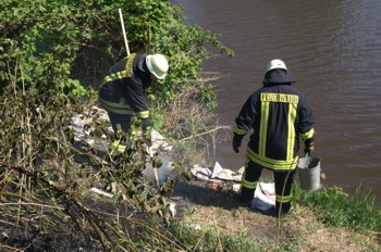 Die Freiwillige Feuerwehr Norden rückte darauf mit zwei Löschfahrzeugen und 18 Einsatzkräften an. Da die Brandstelle nur sehr schwer zugänglich war, ließen die Feuerwehrleute ihre modernen Fahrzeuge an der Straße stehen und griffen zu konventionellen Mitteln. Mit einem Eimer schöpften sie Wasser aus dem Kanal und löschten die Flammen ab. Ebenfalls setzen sie Feuerpatschen ein, mit ihnen wurde das Feuer ausgeklopft.