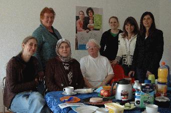 Die beiden Gäste (Mitte) des "Familienfrühstücks" werden im Manforter Laden bestens betreut: Das Team v. l.: um Marianne Strunz (stehend), Daniela Wittwer, Britta Bruckmann und Dorota Kürten sind mit der ersten Resonanz zufrieden, Claudia Falk-Trude (ganz rechts) vom Jugendamt Leverkusen ebenfalls.