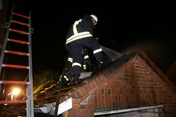 Garagenbrand gefährdet Wohnhaus Um kurz nach Mitternacht geriet am Sonnabend im Norder Ortsteil Tidofeld eine Garage in Brand. Als kurz nach der Alarmierung die ersten Einsatzfahrzeuge der Freiwilligen Feuerwehr Norden im Wikingerweg eintrafen, schlugen die Flammen bereits aus dem Garagendach und drohten auf eine Doppelhaushälfte überzugreifen. Durch den schnellen Einsatz der Feuerwehr konnten die Flammen zügig niedergeschlagen und die Gefahr für das Wohnhaus gebannt werden. Der Schaden an der Garage ist jedoch erheblich. Wodurch das Feuer ausgelöst wurde, konnte in der Brandnacht nicht geklärt werden. Die Norder Wehr war mit fünf Fahrzeugen und etwa 40 Kräften im Einsatz, ebenfalls das Deutsche Rote Kreuz, die Polizei sowie der Notdienst des Energieversorgers EWE. Text und Foto: Thomas Weege