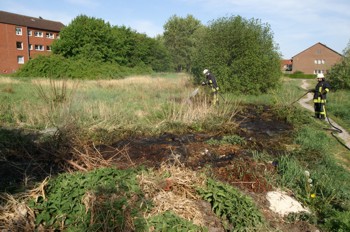 Flächenbrand und Menschenrettung Während viele Väter mit ihren Kindern die letzten Vorbereitungen für den Muttertag morgens trafen, ereilte die Freiwillige Feuerwehr Norden am Sonntag um 9.15 Uhr die Meldung über einen Flächenbrand am Ende des Feldpfades. Auf einer Wiese brannten Gras sowie Gartenabfälle auf einer geschätzten Fläche von rund 30 Quadratmetern. Ein Mitarbeiter des Baubetriebshofes der Stadt Norden, gleichzeitig Feuerwehrmann in Norden, traf als erster an der Einsatzstelle ein und begann mit einer Schaufel von seinem Arbeitsfahrzeug die Flammen einzudämmen. Nachdem seine Kameraden mit einem Löschfahrzeug eintrafen, übernahmen sie die Brandbekämpfung mit einem Strahlrohr. Nach wenigen Minuten war das Feuer gelöscht.