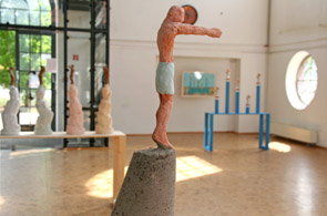 Die studierte Bildhauerin und Künstlerin zeigt ihre Arbeiten, die zumeist aus Figuren und Sockeln bestehen. „Der Sockel spielt im Gesamtkunstwerk eine bedeutende Rolle“, erklärt die gebürtige Gelsenkirchenerin. Für die Figuren verarbeitet sie größtenteils Keramik, das Material der Sockel ändert sich. Das Ergebnis sind verschiedene Themen. Vier von ihnen sehen Besucher ab sofort in den Räumen der Maschinenhalle: „Turm zu Babel“, „Die rauen Schalen“, „Volle Fahrt voraus“ und Monika Simons neueste Arbeit „Pegelstände“. Letzteres ist lediglich als Miniaturformat des Originals zu sehen, das demnächst, 2,50 Meter hoch, im Kölner Skulpturenpark stehen wird.