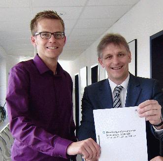 Landrat Michael Makiolla und Stefan Eggert (l.) mit den Handlungsorientierungen, einer Arbeitshilfe für die Umsetzung des Bildungs- und Teilhabepaketes. Foto Kreis Unna