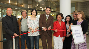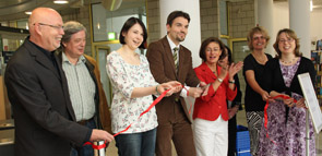 Eine viertel Stunde vor Neueröffnung hatte sich vor der Stadtbibliothek im Glashaus schon eine kleine Menschenmenge angesammelt. Denn ab heute freuen sich zahlreiche Hertener darüber, in der umgebauten Stadtbibliothek wieder ihre Lieblingsmedien auszuleihen. Sechs Wochen lang haben die Umbauarbeiten gedauert. Nun gab Bürgermeister Dr. Uli Paetzel mit Mitarbeitern der Bücherei, der Verwaltung und des ZBH feierlich den Startschuss für das neue Ausleihsystem.