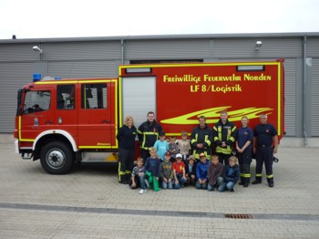 Auch die zweite Veranstaltung des Schnupperkurses "Ein Nachmittag bei der Feuerwehr" im Rahmen des Ferienprogramms der Aktionsgemeinschaft Ferienprogramm Stadt Norden war wieder ein Erfolg. 12 Kinder konnten unter Anleitung vom stellv. Stadtjugendfeuerwehrwart Uwe Müller und einigen Mitgliedern der Einsatzabteilung wieder die Fahrzeuge der Freiwilligen Feuerwehr Norden erkunden und die Aufgaben eines Feuerwehrmitgliedes kennenlernen. Im Anschluss wurde noch ein Löschangriff vorgenommen und eine kurze Fahrt mit einem Löschfahrzeug unternommen. Mit dabei war diesmal auch ein Kamerateam des Regionalsenders heimatLIVE.