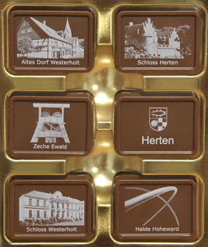7,50 Euro kosten die zwölf Täfelchen (120g) im Geschenkkarton, die neben dem Stadtwappen auch Fotos des Alten Dorfes, der beiden Schlösser, der ehemaligen Zeche Ewald und der Halde Hoheward zeigen. Die nach Geschmacksrichtung sortierte Schokolade wurde von einer Paderborner Spezialfirma aus frisch gemahlenen Kakaobohnen produziert und in einem patentierten Verfahren mit weißem Zuckerguss bedruckt.