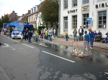 Bei diesem Spiel mussten die Kinder mit Hilfe eines Wasserstrahls aus einem D-Strahlrohr Dosen in ein Tor befördern. Viele Kinder nutzten dieses Spiel, um mal einen "richtigen" Feuerwehrschlauch auszuprobieren. Das Wetter hätte allerdings etwas besser sein können ...