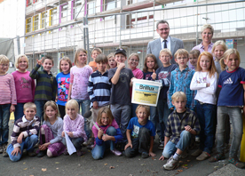 Neue Fassade strahlt und dämmt - Sanierung der Wilhelmsthalschule Calden Calden. Das Sonderinvestitionsprogramm des Bundes, der Investitionspakt des Landes Hessen und Eigenmittel des Landkreises machen es möglich: An der Wilhelmsthalschule Calden wurden Klassenräume und Toiletten saniert sowie der Brandschutz auf den heutigen Stand der Technik gebracht. „Als letztes stand noch die Fassadensanierung an, bei der wir jetzt die erste Hälfte der Arbeiten vor dem Winter fertig stellen können“, informiert Landrat Uwe Schmidt bei einem Besuch der Caldener Grundschule. Insgesamt flossen seit 2010 rund 680.000 Euro in die Wilhelmsthalschule. Schmidt: „250.000 Euro kamen vom Bund, 298.000 Euro vom Land und die restlichen 132.000 Euro aus dem Kreishaushalt“. Diese Vernetzung der unterschiedlichen Finanzquellen habe die umfangreichen Sanierungsarbeiten erst ermöglicht. Nachdem die Fenster des Schulgebäudes ausgetauscht, die Beleuchtungsanlage erneuert und eine Lüftung eingebaut wurden, konnte bereits für die eine Seite der Schule die Wärmedämmung angebracht werden. „Im nächsten Jahr werden wir dann auch die restliche Fassade dämmen“, so Schmidt weiter. Dafür stehen weitere 135.000 Euro aus Kreismitteln zur Verfügung. Mit den in den letzten Jahren vorgenommenen Sanierungs- und Dämmmaßnahmen habe der Landkreis nachgewiesen, dass die von der Europäischen Union beschlossenen Effizienzziele auf für öffentliche Gebäude umsetzbar sind. „20 Prozent Steigerung bei der Energieeffizienz von Gebäuden ist machbar und wir als Landkreis gehen hier mit gutem Beispiel voran“, betont der Landrat. Die für diesen Zweck getätigten Investitionen müssten zwar über Kredite finanziert werden. Schmidt: „Diese Schulden sind allerdings keine Belastungen für zukünftige Generationen“. Jeder Euro, der heute für Energieeffizienz investiert werde, entlaste die Umwelt und verhindere eine weitere Verschlechterung des Klimas. „Da ist es nur gerecht, dass auch zukünftige Generationen, die davon profitieren, auch an der Finanzierung beteiligt sind“, rechnet der Landrat abschließend vor. Pressekontakt: Pressestelle LANDKREIS KASSEL, Harald Kühlborn Zu dieser Meldung können wir Ihnen folgendes Medium anbieten: Wilhelmsthalschule Calden 001 Auf dem Foto sieht man die glücklichen Grundschulkinder mit Landrat Uwe Schmidt und der stellv. Schulleiterin Vanessa von Bergen.