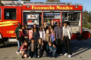 Die Reisegruppe bekam mit ihren deutschen Gastfamilien eine englischsprachige Führung durch die Gebäude der Feuerwehr und durfte auf dem Hof selber eine kleine Löschübung durchführen. Schüler als auch Lehrer waren sichtlich beeindruckt von der Ausstattung der Norder Wehr sowie dem Aufbau des Lösch- und Hilfeleistungswesens in Deutschland. Die Sudanesen schilderten wie es bei ihnen im Sudan aussieht, wenn sie bei einem Unglücksfall Hilfe benötigen. Dieser Vergleich könnte unterschiedlicher nicht sein, schließlich ist der Sudan eines der ärmsten Länder der Welt. In der Hauptstadt Khartum, dort besuchen die Kinder eine Privatschule, gibt es zwar eine Feuerwehr, jedoch komme die meist erst wenn ein Haus bereits abgebrannt ist, so die Gäste. Die Ausrüstung ist dort bei weitem nicht so umfangreich. Technische Hilfe bei Unfällen leistet dort in der Regel die Polizei. Eine einheitliche Notrufnummer gibt es dort auch nicht. Während der Löschübung fragten die Schüler nach der Herkunft des verwendeten Wassers. Das dieses Wasser herkömmliches Trinkwasser sei, konnten die Sudanesen zunächst nicht glauben. Auch der großzügige Umgang war gewöhnungsbedürftig. Aber das Wasser zu verspritzen, bereitete den Schülern große Freude.