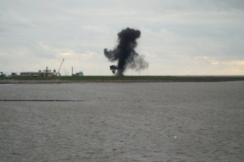 Eine riesige Rauch- und Dreckwolke stieg weit sichtbar in den Himmel. Der unüberhörbare Knall erschreckte nicht nur die Schaulustigen an der Absperrgrenze, sondern auch eine große Schar Vögel im Deichvorland.