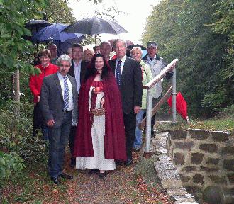Wasser bergauf 003 Die Eröffnungsgäste noch im trockenen Zustand vor der Wanderung (vorn von links nach rechts Bürgermeister Rüdiger Henne, Peter Nissen, Schneewittchen und Peter Siemon (Kasseler Sparkasse).