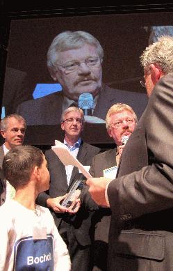 Bühne frei für vorbildliches kommunales Energiesparen: Bocholt war mit 14 anderen Kommunen in der historischen Stadthalle von Wuppertal dabei. NRW-Minister Johannes Remmel (knieend) nahm die Auszeichnung vor.