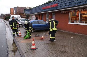 Die dreiköpfige Besatzung streute vor Ort einen zirka zwei Quadratmeter großen Ölfleck auf dem Parkplatz einer Fleischerei ab. Weitere Maßnahmen gab es wegen der geringen Menge an Öl nicht zu ergreifen. Text: U. Bents/T. Weege Fotos: T. Weege