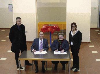 Im Beisein von Olaf Pestl, Leiter des Ressorts Planen, Bauen, Umwelt und Klimaschutz der Stadt Iserlohn (links), und Andrea Schumann, Leiterin des FFB (rechts), unterschrieben KIM-Leiterin Claudia Zawada und Volker Holländer, Geschäftsführer der Diakonie Ruhr-Mark, (beide sitzend) den Mietvertrag.
