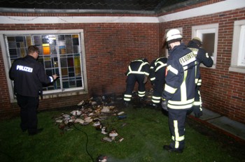Gegen 17.40 Uhr wurde der Freiwilligen Feuerwehr Norden das Feuer gemeldet. Der Behälter für Papiermüll stand auf der Rückseite der Kirche, direkt an einem Fenster.